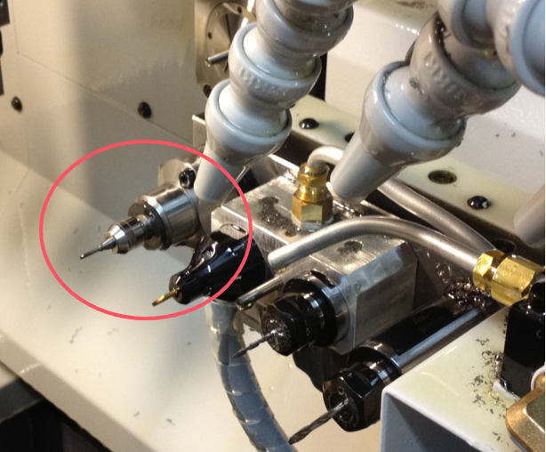 如图所示,就是西铁城走心机A20背轴加装中西高频铣BM-322FL的案例。装在这个部位,可以用于钻微孔、铣微槽、铣小径螺纹等等小零件的高精密加工。