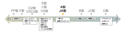 上图所示为橡胶硬度计的种类图, 根据试样的种类设计不同的硬度计. 符合 JIS K 6253标准的A型橡胶硬度计是最普遍最常用的一款.但是通常情况下,测量值在10点~90点之间,使用A型硬度计,A90点以上时使用D型硬度计(硬质材料使用),A20点以下时使用C型或E型硬度计(软质材料使用)。就是说,根据试料的种类选择合适的机型最重要。